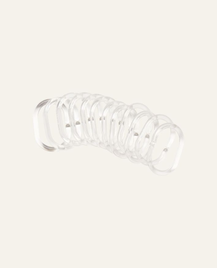 Draperiringar i genomskinlig plast för upphängning av duschdraperi. Duschdraperiringarna är enkla att använda och passar alla draschstänger. Förpackningen innehåller 12 stycken.