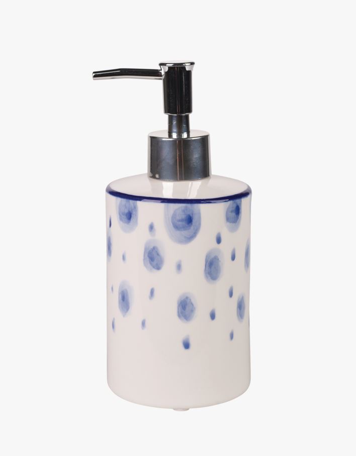 Tvålpump med blått mönster av kalksten. En tvålpump med klassiskt formspråk och silvrig pump. En praktisk tvålpump som du enkelt kan fylla på med din favorit tvål. Tvålpumpen tillhör serien Dotty som är en badrumsserie med flera delar, kombinera gärna flera delar ur samma serie för ett enhetligt intryck i badrummet eller köket.
