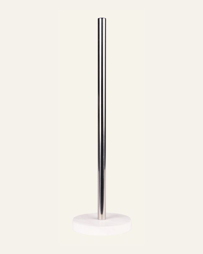 Hållare för toalettrullar med fot av marmor. Hållaren har plats för fem rullar, och staven är silverfärgad.