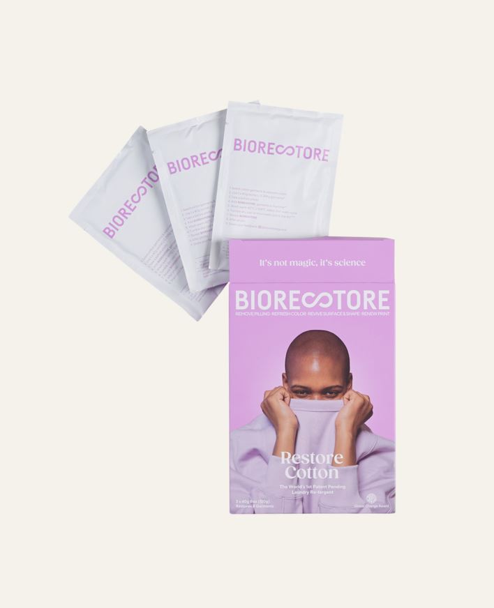Biorestore, tvättmedel som förnyar och livar upp gamla och slitna kläder. Biorestore tar bort noppor från plaggets yta, fräschar upp färgen, justerar fibrerna och omvandlar plaggets tygstruktur. 1 ask med Biorestore innehåller 3 dospåsar med Bioresto...