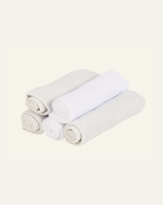 Liten användbar trasa i 5-pack. Tre färgade och två vita små frottélappar.