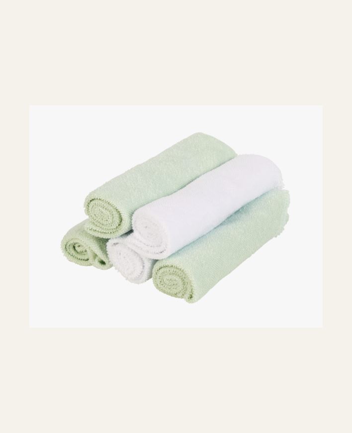 Liten användbar trasa i 5-pack. Tre färgade och två vita små frottélappar.