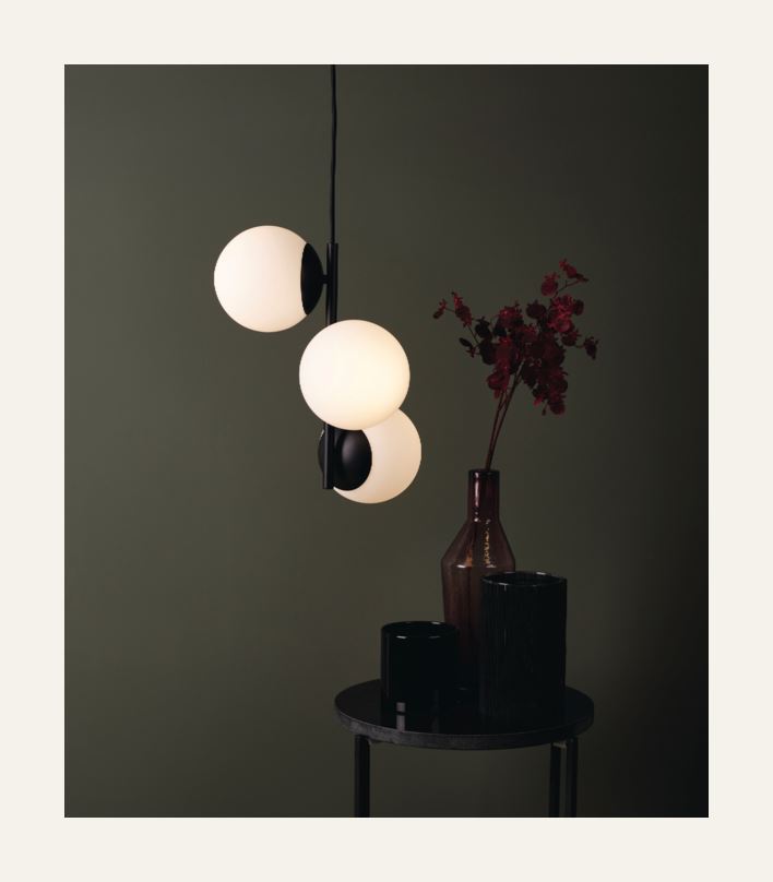 Taklampa från Funkle med tre runda lampskärmar i munblåst glas. Lamparm i metall. Lampan blir en snygg dekoration som tar för sig i rummet. Komplettera med ljuskällor, E14.