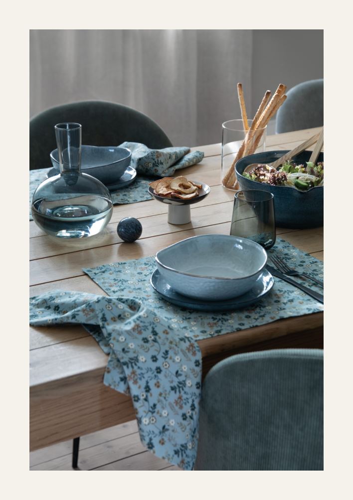Blommig bordstablett i bomull. En bordstablett skyddar bordsytan samtidigt som den är dekorativ.