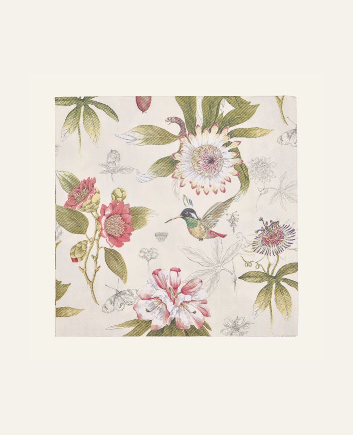 Pappersservett med dekorativt mönster av fåglar och blommor. Servetterna har en harmonisk färgskala och vackert mönster som passar lika bra till vardags som till fest. Pappersservetter är en liten detalj som bidrar med en lyxig känsla till dukningen....