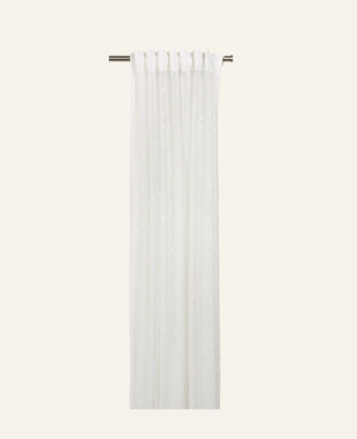Gardin med ton i ton broderat blommönster. En skir gardin av polyester som ramar in fönstret och skapar en ombonad känsla utan att skärma av ljuset. Gardinen är en multibandslängd med flera upphängningsalternativ, kan hängas på gardinstång och skena. Multibandslängd innebär att den kan hängas upp på tre olika sätt: med fingerkrokar, rynkbandskrokar eller hängas upp direkt på stången med hällor. Gardinen har en overlocksöm nedtill. Förpackningen innehåller 1 gardin. Läs mer om multibandslängder i vår gardinguide!