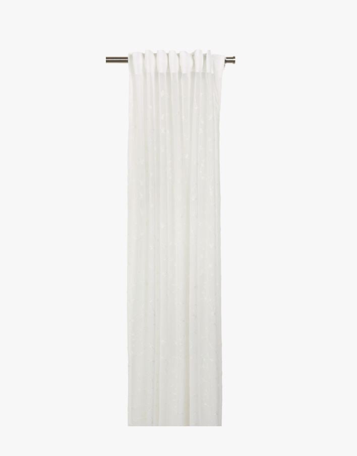 Gardin med ton i ton broderat blommönster. En skir gardin av polyester som ramar in fönstret och skapar en ombonad känsla utan att skärma av ljuset. Gardinen är en multibandslängd med flera upphängningsalternativ, kan hängas på gardinstång och skena. Multibandslängd innebär att den kan hängas upp på tre olika sätt: med fingerkrokar, rynkbandskrokar eller hängas upp direkt på stången med hällor. Gardinen har en overlocksöm nedtill. Förpackningen innehåller 1 gardin. Läs mer om multibandslängder i vår gardinguide!