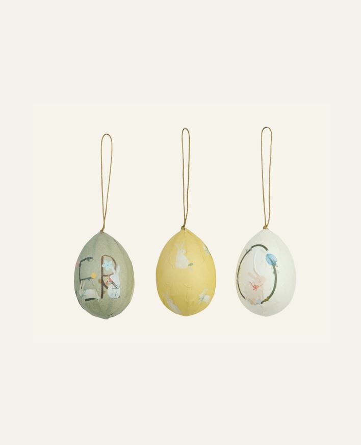 Dekorativa påskägg för kvistar och grenar. Det finns 3 stycken små ägg i påsen. Äggen är gula, gröna och beige med kaninmotiv. Alla ägg kommer med snöre och kan hängas upp var du än önskar.