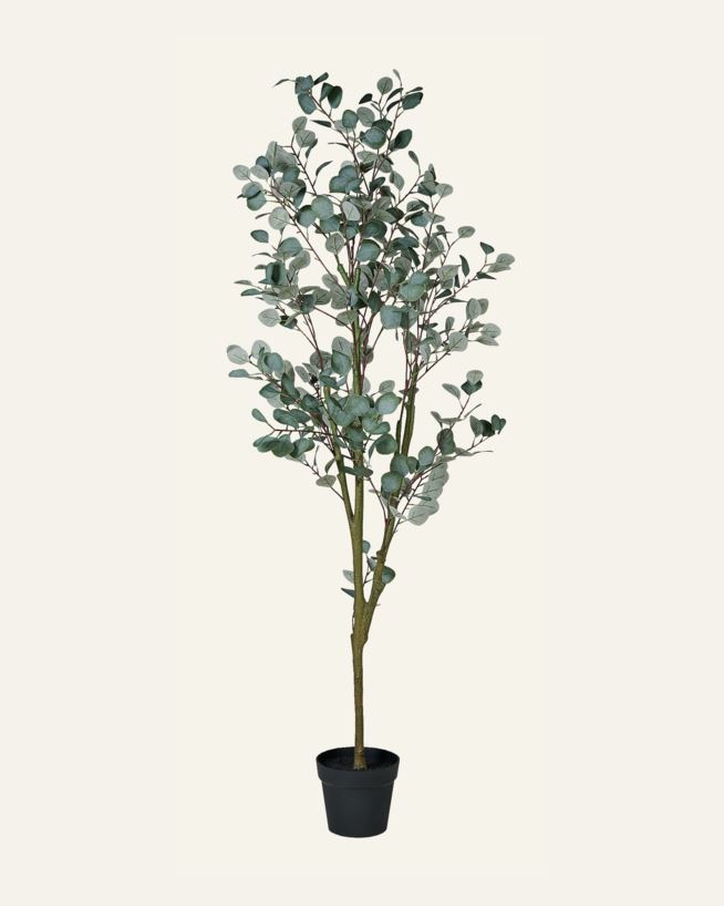 Ett konstgjort eukalyptusträd med naturtrogna, ständigt gröna blad som ger en fräsch känsla till inredningen. Passar i både hem och offentliga miljöer och kräver ingen skötsel, vilket gör det enkelt att skapa en harmonisk atmosfär.