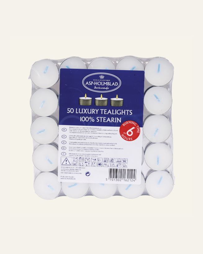 Värmeljus av 100% stearin i en metallkopp. Förpackningen innehåller 50 stycken värmeljus. Varje ljus har en brinntid på cirka 6 timmar.