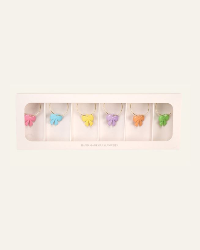 Förpackning med sex olika glasmarkörer som fästs runt glasets fot. En dekorativ detalj som tillför stil till dukningen och gör det lätt att hålla reda på vilket glas som tillhör vem. Passar både till fest och vardag, och blir en funktionell accessoar...