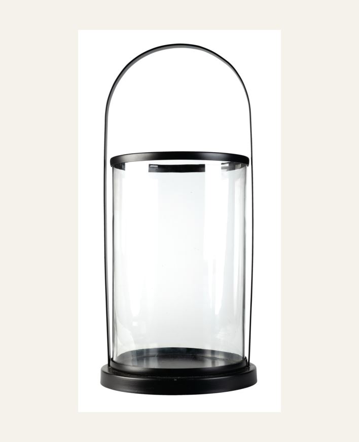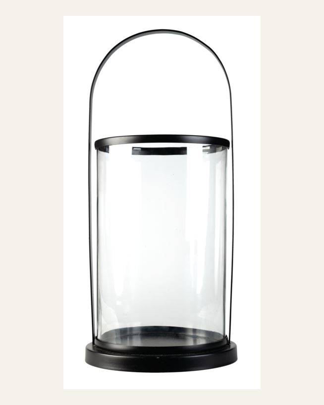 Rund lykta i metall med glasväggar runt. Placera flera ljuslyktor bredvid varandra för ett vackert stilleben.
