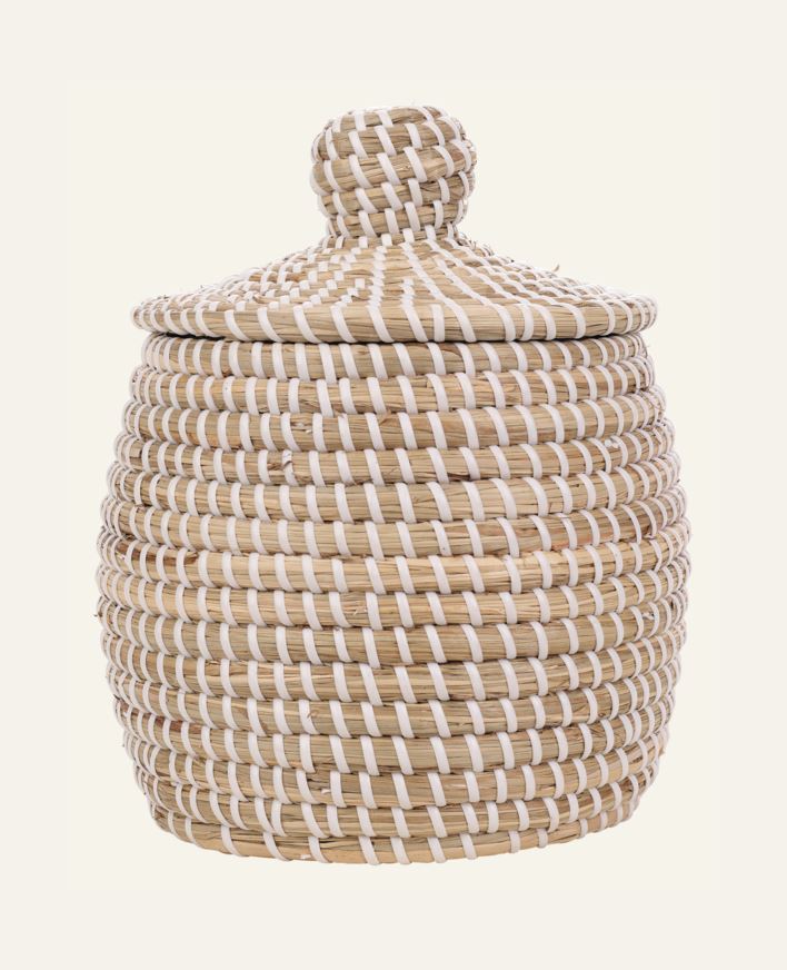 Rund förvaringskorg med lock. Korgen kan användas till förvaring av handdukar i badrummet, små förvaring i vardagsrummet eller till leksaker i barnrummet. En förvaringskorg som är lika dekorativ som funktionell, vilket gör att den passar i flera olik...