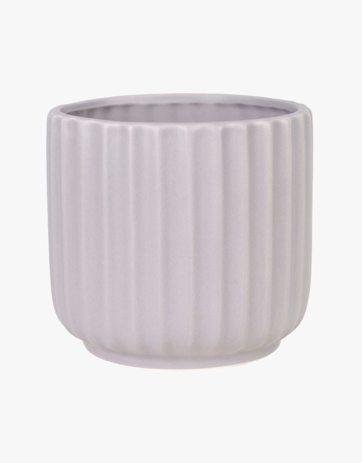 Stilren och fin blomsterkruka av keramik med dekorativa räfflade sidor.