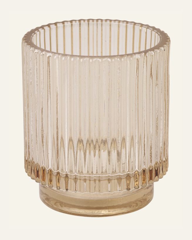 Ljuslykta i glas med räfflad struktur. Med storlek 7x8cm och plats för ett värmeljus.