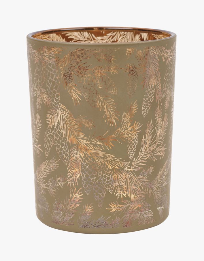 Ljuslykta i glas med granbarr och kottar på. Lyktan blir en fin dekoration som den är eller tillsammans med andra ljusstakar och ljuslyktor.
