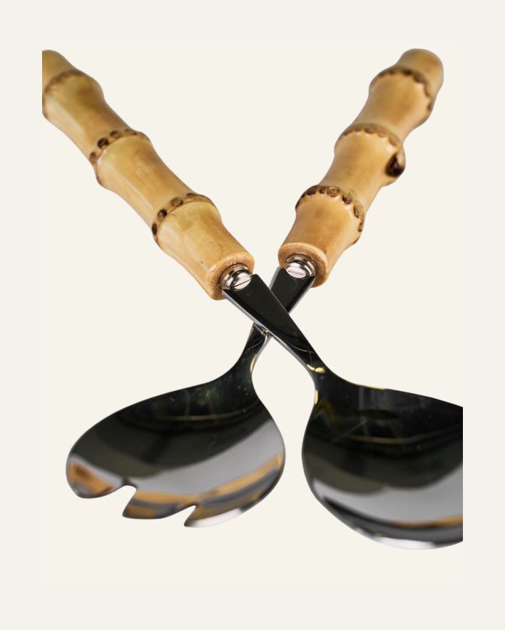 Trendiga salladsbestick i rostfritt stål med bambuhandtag. Handdisk rekommenderas, tål ej diskmaskin.