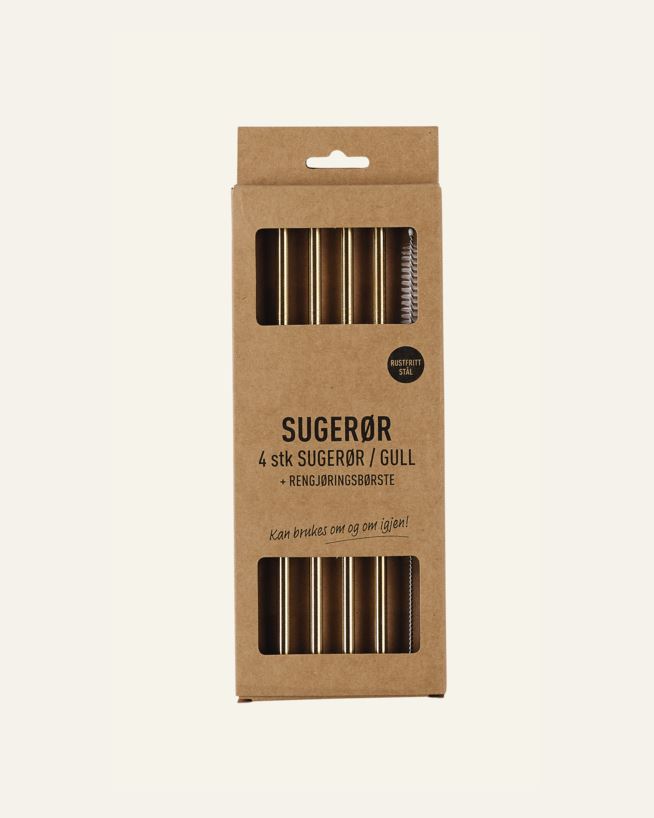 Förpackning med 4 sugrör i metall med praktisk borste för rengöring. Guldfärgade sugrör som kan användas om och om igen. I förpackningen ingår en liten borste som gör det enkelt att rengöra sugrören efter varje användningstillfälle.