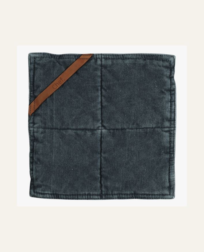 Klassisk grytlapp med dekorativ ögla för upphängning. En mjuk grytlapp i bomull med dekorativ hängare i skinn på ena sidan med texten “chef”. En praktisk grytlapp som kommer till stor användning i köket. Passar lika bra till matlagning som bakning fö...