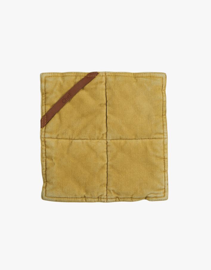 Klassisk grytlapp med dekorativ ögla för upphängning. En mjuk grytlapp i bomull med dekorativ hängare i skinn på ena sidan med texten “chef”. En praktisk grytlapp som kommer till stor användning i köket. Passar lika bra till matlagning som bakning för att skydda händerna mot varma ugnsformar och grytor. Kombinera gärna med matchande grytvante, Courduroy.