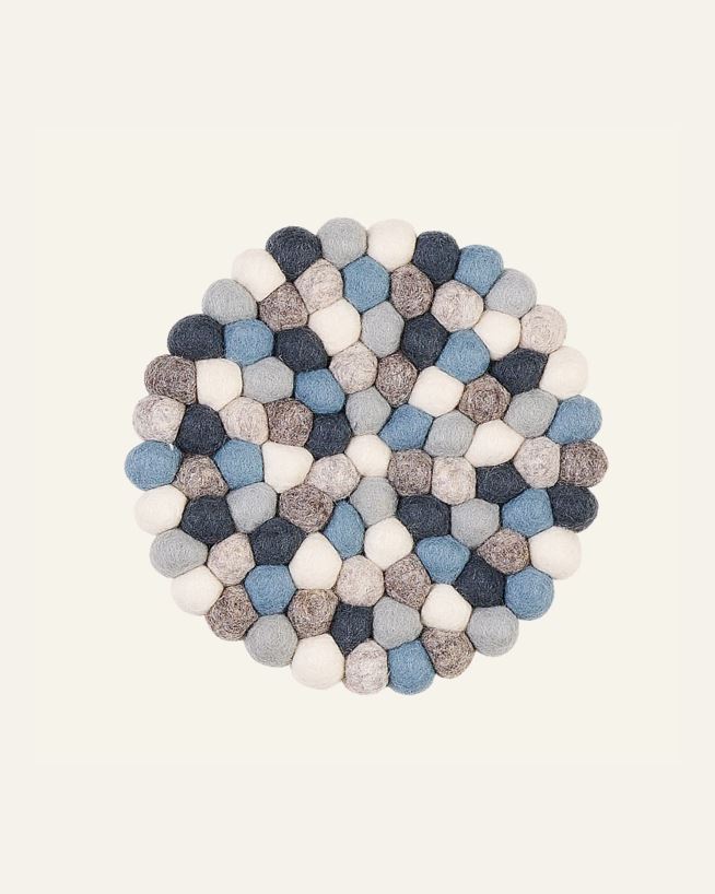 Mjukt grytunderlägg i ull som skyddar bordet från varma kastruller. Ett underlägg med sammansatta små ullbollar i fina nyanser.