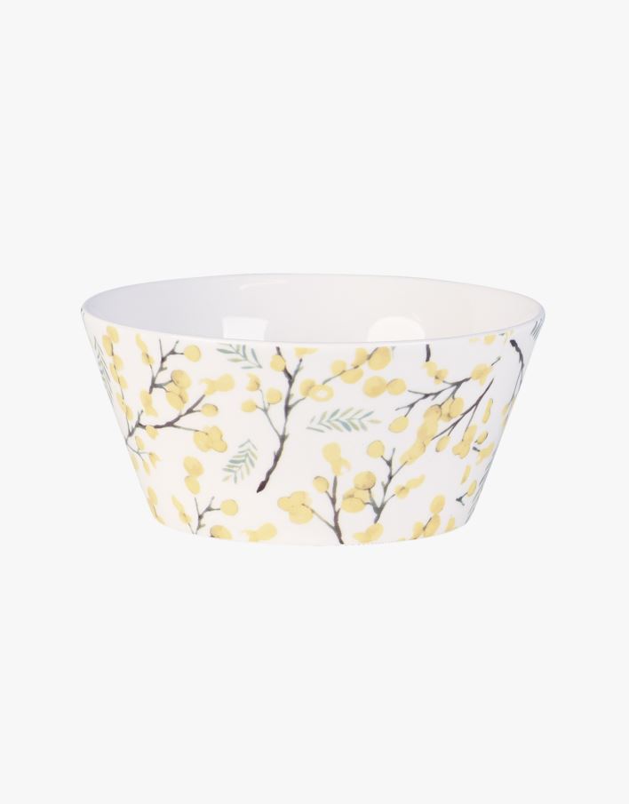 En mindre skål med dekorativt mönster av mimosa. Skålen tillhör serien Mimosa, vars mönster finns på mugg och servetter som är fina att kombinera. En liten skål som passar bra till frukosten och för tillbehör vid middagen. Tål diskmaskin och mikrovågsugn.
