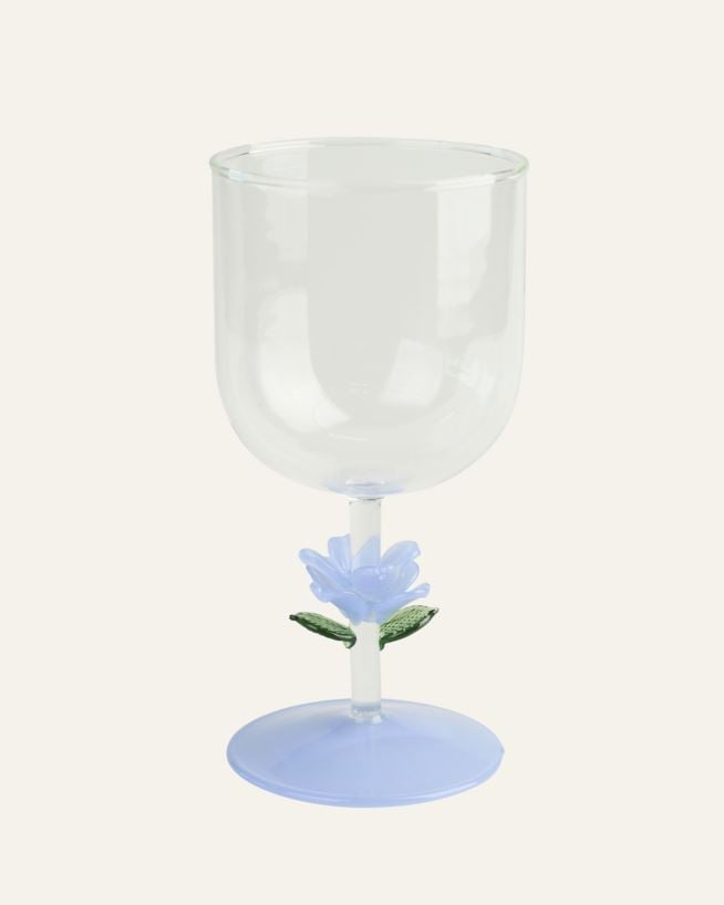 Stiligt vinglas med blomma och blad på foten. Handgjort av borosilikatglas, tål även diskmaskin. Perfekt vinglas för alla våren och sommarens fester.