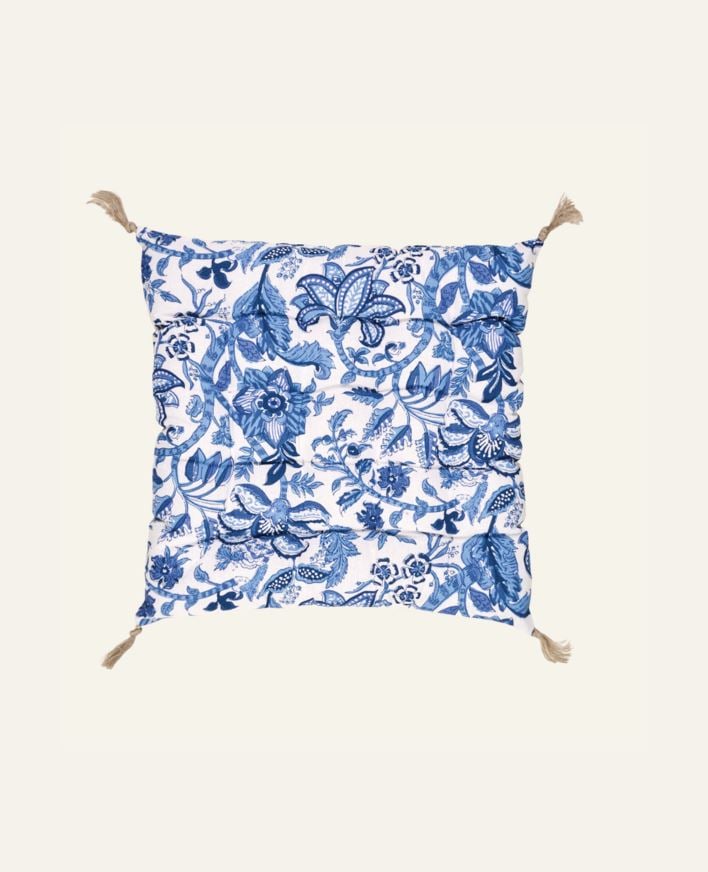 Sittdyna med klassiskt blommönster i blått och vitt. Tofsar i hörnen.