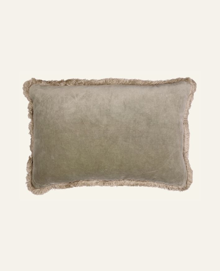 Mjuk prydnadskudde i bomullsvelour med eleganta fransar. En lyxig enfärgad prydnadskudde i velour med fransar som löper runt hela kuddens ytterkant. Kudden har ett vackert lyster med skiftningar i nyans beroende på hur ljuset faller, en vacker kontra...
