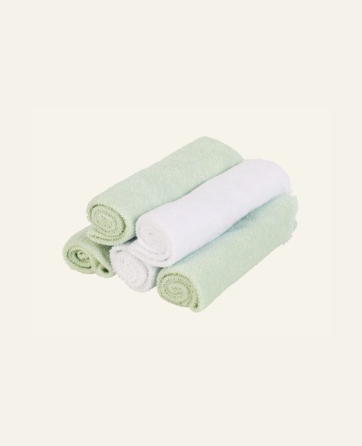 Liten användbar trasa i 5-pack. Tre färgade och två vita små frottélappar.