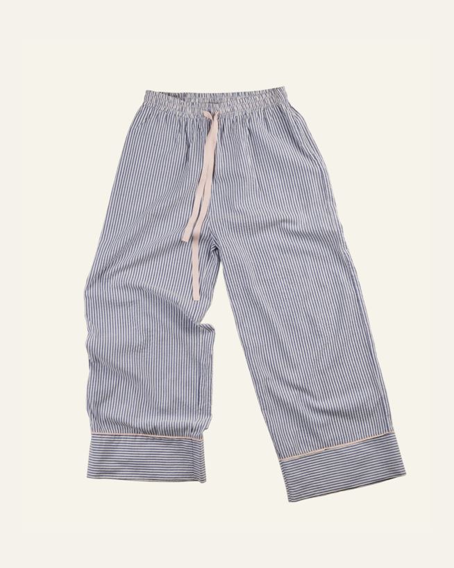 Tunn pyjamasbyxa i ljus korall med vita små ränder i mjuk bomullsbäckebölja. Pyjamasbyxan är one size och har knytning i midjan.