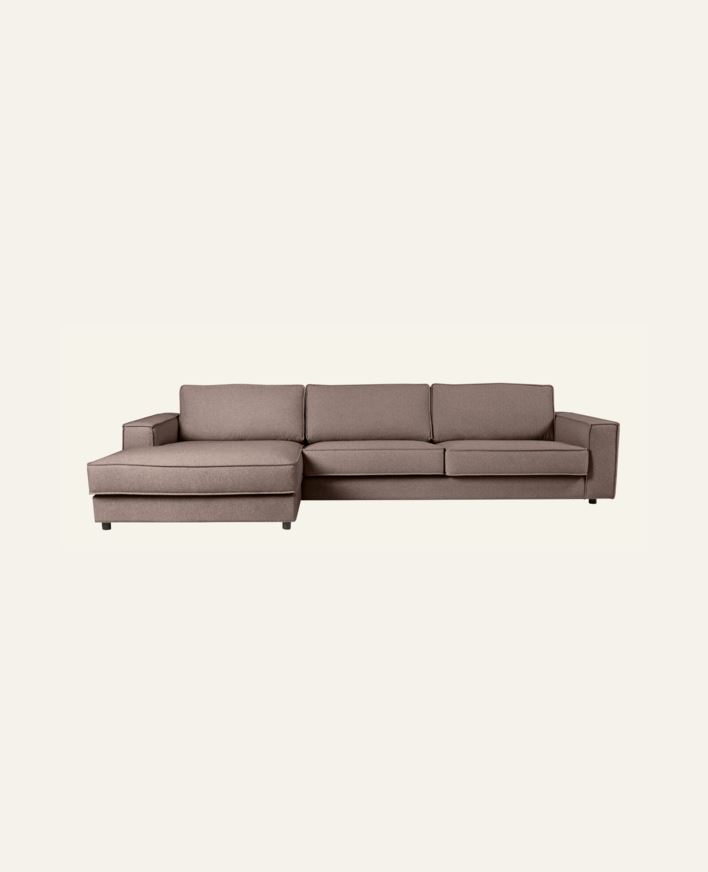 Trendig och bekväm soffa med fransk söm och textil i naturmaterial. Placeringen av ände & schäslong beskrivs utifrån hur du ser soffan framifrån. Här visas schäslong till vänster. Den robusta designen med breda armstöd och dolda ben tillför komfort i...