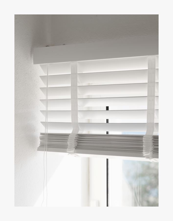 Frihängande klassisk träpersienn med färgmatchande stegband eller traditionell snördragning. Kan levereras i bredder upp till 300 cm och höjd 270 cm. Här kan du läsa mer om hur du mäter och monterar träpersiennen.