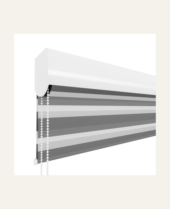Duo rullgardin är en rullgardin med två lager tyger med tvärgående ränder. Ränderna har öppna och stängda fält. Det fina med systemet är att man kan öppna och stänga fälten genom att bara justera gardinen något i höjd. Med en duo rullgardin kan man enkelt justera insynen ungefär som med en persienn. Duo rullgardin levereras antingen med en täckande kassett som döljer rullgardinstyget eller med en monteringsprofil upptill. Båda systemen fästs enkelt med klämmor som skruvas fast i väggen eller i taket. Välj mellan metall eller plast dragkedja. Välj mellan färgerna vit, svart, antracit eller grå på kassetten eller monteringsprofilen. Det finns ett stort urval av färger på tygerna. Levereras med rund metall på nedre fältet. Läs mer om hur du mäter här!