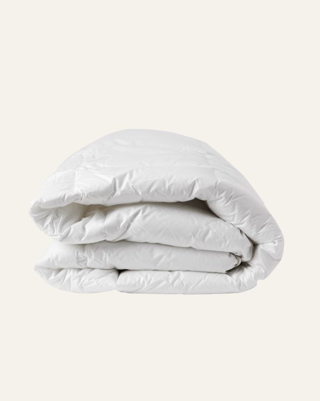 Ebba medelvarmt fibertäcke är ett täcke fyllt med återvunnen microfiber polyester och med en dunliknande känsla. Den mjuka microfiberfyllningen gör att täcket formar sig mycket bra runt kroppen. Täcket är sytt i rutor för att säkerställa jämnt fördelad fyllning.